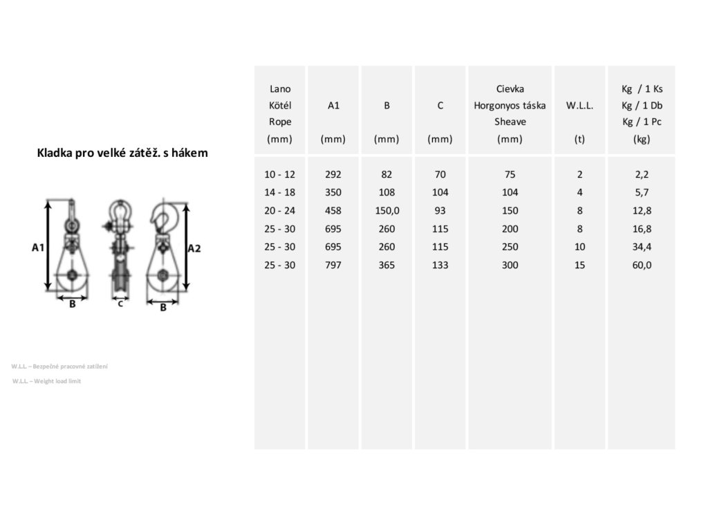 Kladka montážní pro velká zatížení s hákem i s třmenem je určena pro ocelová lana. Je určena do těžkých provozů. Kladka nemá ložisko a má odklápěcí bočnice pro pohodlnější opevnění lana. Bočnice jsou z lakovaného plechu. Oko a rolna je ze zušlechtěné oceli. Kladka se dodává v 6 velikostech.
